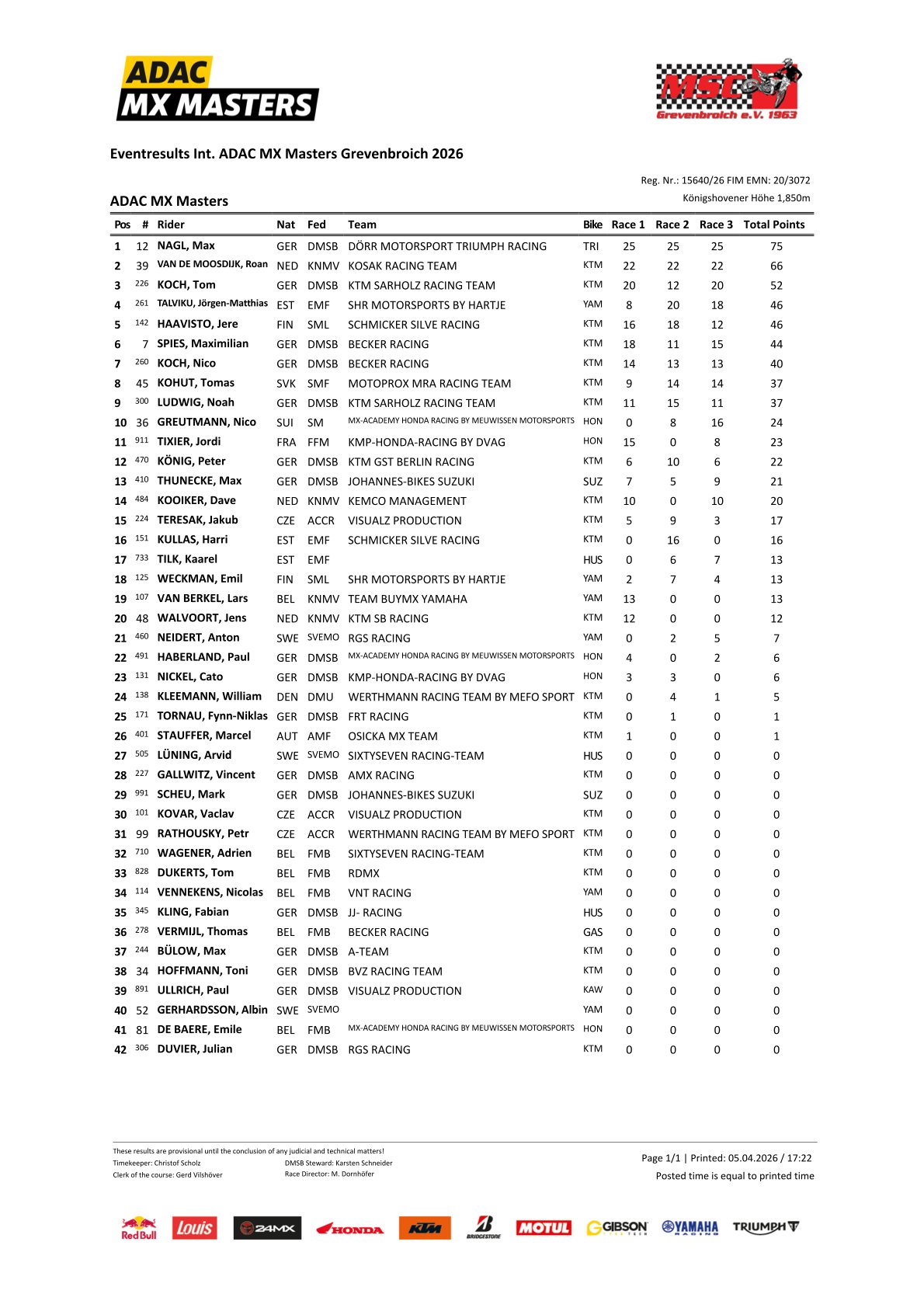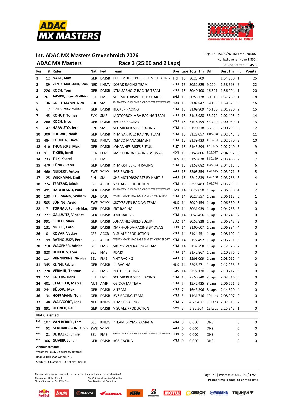 Max Nagl heeft alle drie de manches van de eerste wedstrijd van de ADAC Masters in Grevenbroich weten te winnen. Roan van de Moosdijk werd alle drie de keren tweede en Tom Koch pakte de derde plaats in het dagklassement met een 3-9-3 in de manches.