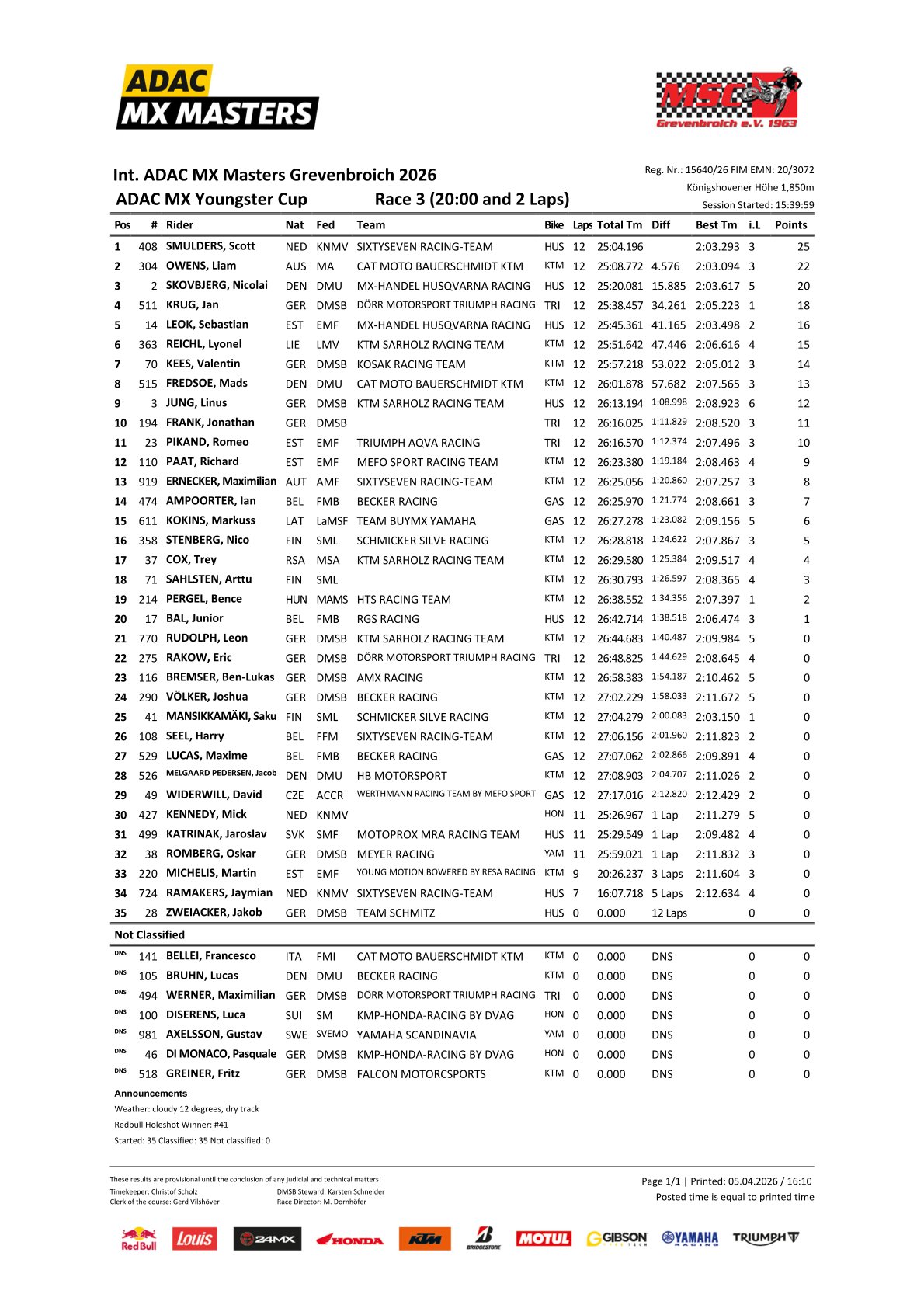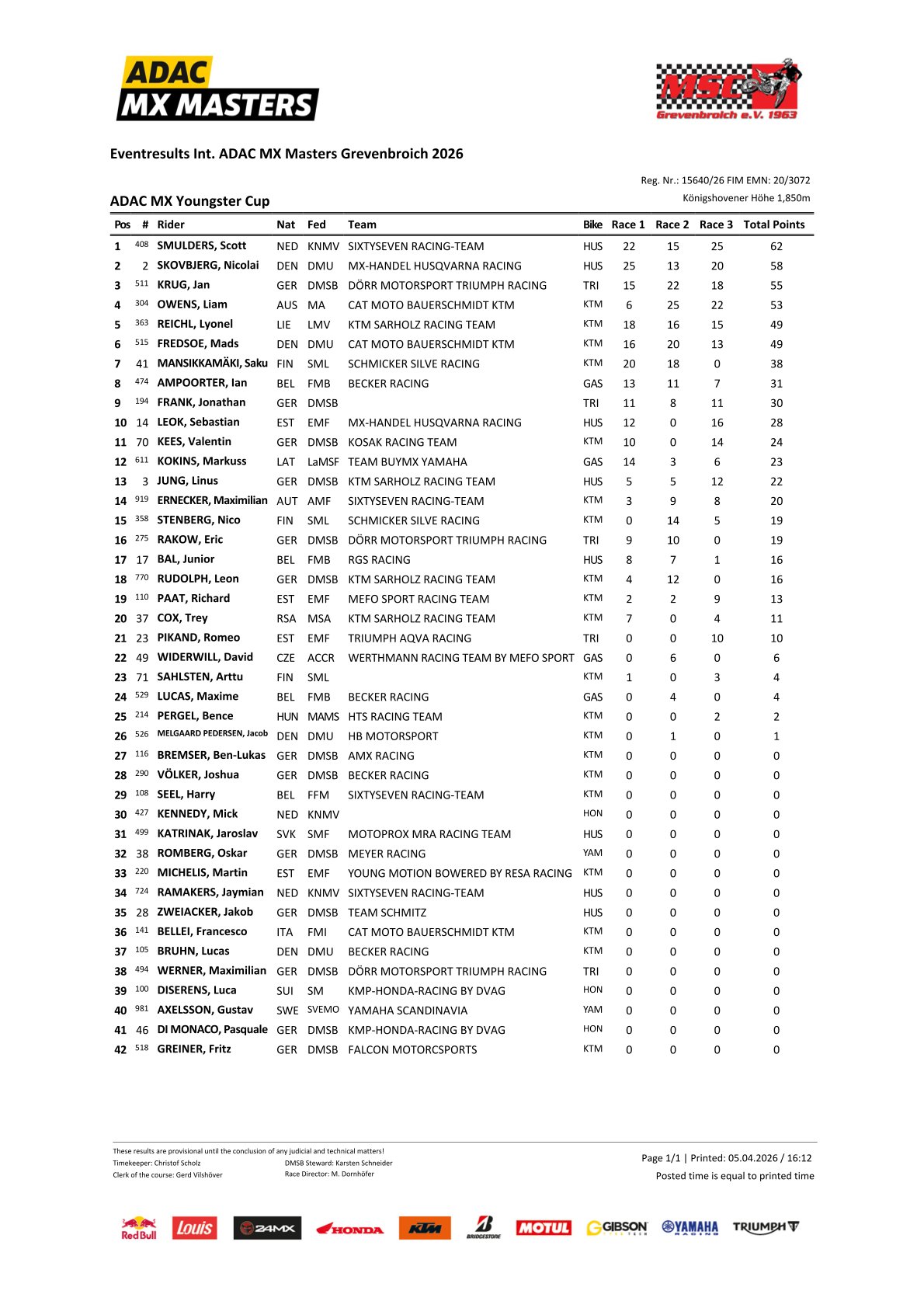 Scott Smulders is de eerste leider in de ADAC Youngster Cup. Hij won de eerste wedstrijd in Grevenbroich met een 2-6-1 in de manches voor Nicolai Skovbjerg 1-8-3 en Jan Krug 6-2-4. Liam Owens en Lyonel Reichl maakten de top 5 compleet. De Belg Ian Ampoorter werd achtste en Junior Bal legde beslag op een zeventiende plaats.