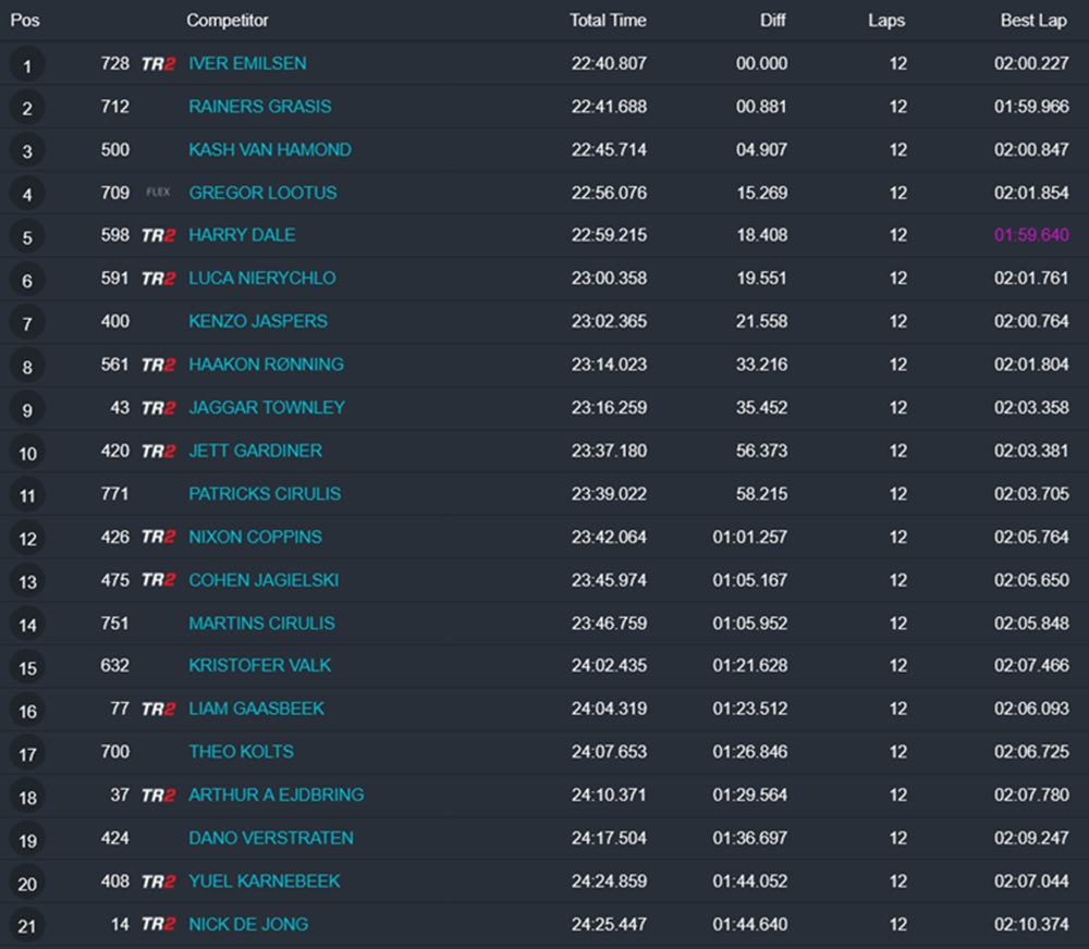 Gregor Lootus eindigde net naast het podium op de vierde plaats, gevolgd door Harry Dale op de vijfde positie.