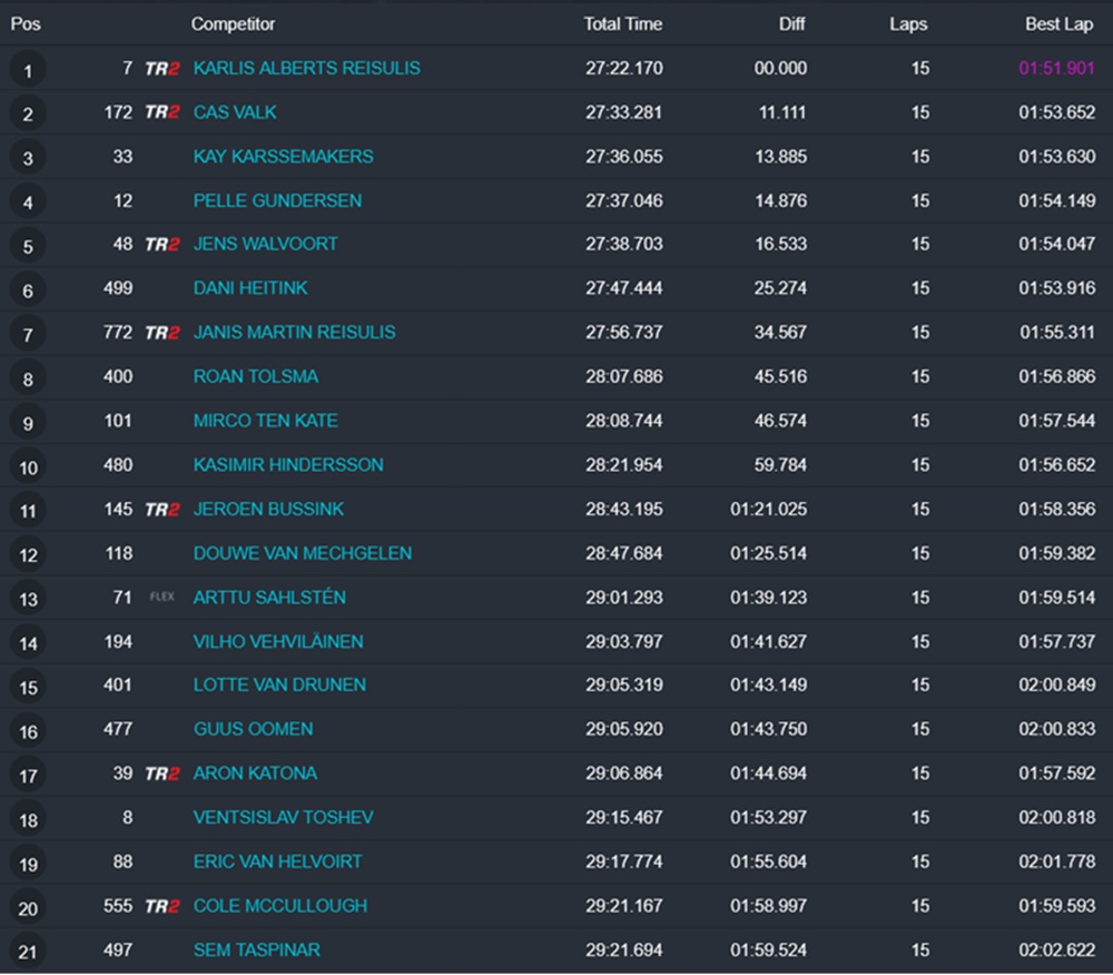 Pelle Gundersen kwam als vierde over de finish, met Jens Walvoort op de vijfde plaats. Dani Heitink werd zesde en Janis Reisulis eindigde als zevende.