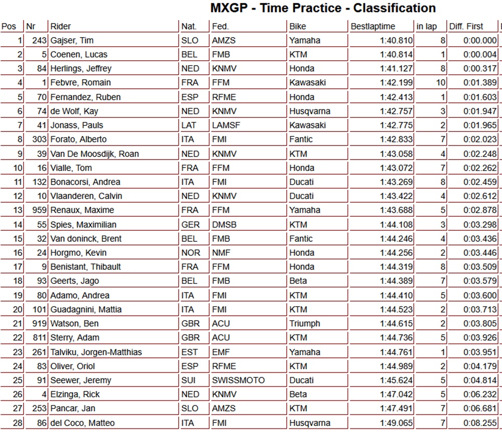 Tijdens de tijdtraining van de MXGP in Italië heeft Tim Gajser de snelste tijd neergezet. Lucas Coenen eindigde als tweede, gevolgd door Jeffrey Herlings op de derde plaats. Romain Febvre werd vierde, Ruben Fernandez vijfde en Kay de Wolf sloot de top zes af.