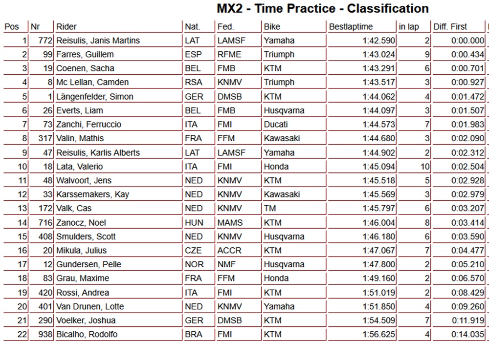 In de MX2-klasse was Jānis Reisulis het snelst. Guillem Farrés en Sacha Coenen eindigden respectievelijk als tweede en derde.