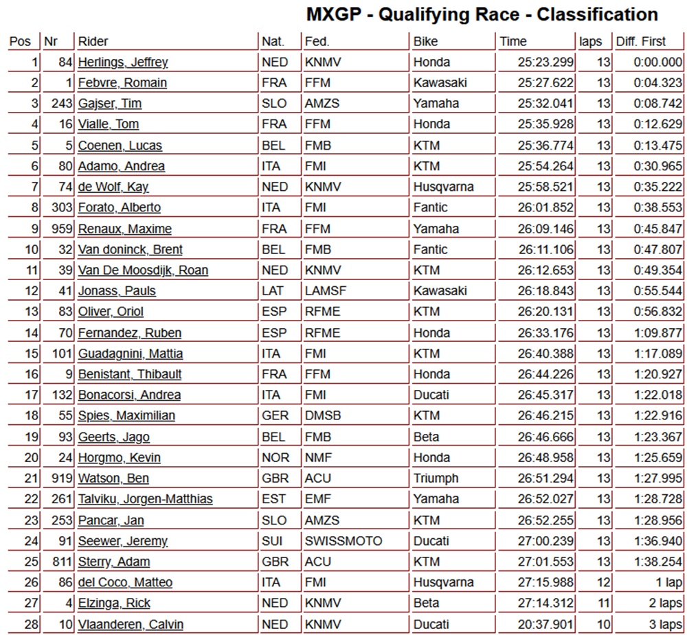Jeffrey Herlings heeft na een spannende strijd met Romain Febvre de MXGP-kwalificatiewedstrijd op zijn naam geschreven. Tim Gajser eindigde als derde, gevolgd door Tom Vialle als vierde. Lucas Coenen op de vijfde plaats. Coenen kwam na een valpartij bij de start sterk terug in de wedstrijd. Andrea Adamo werd zesde, terwijl Kay de Wolf na een indrukwekkende inhaalrace als zevende finishte.