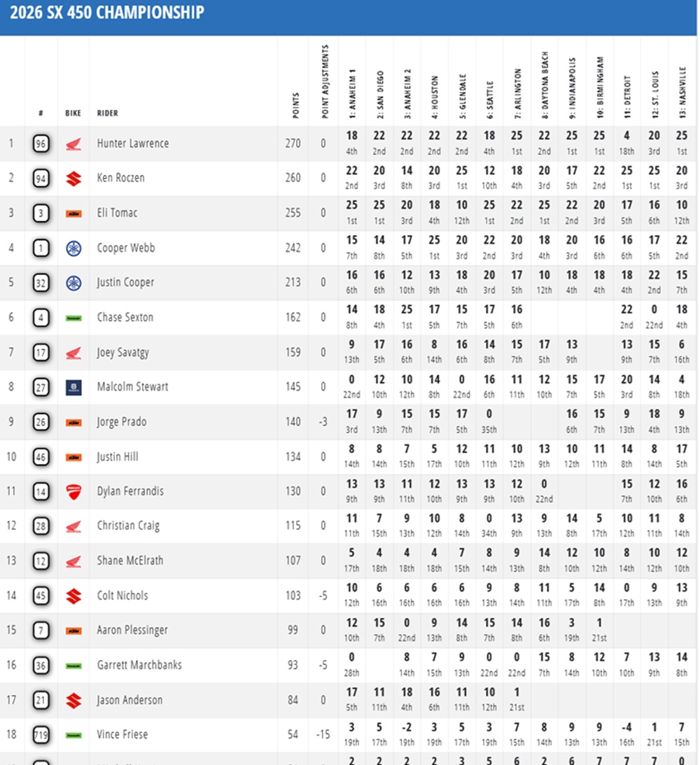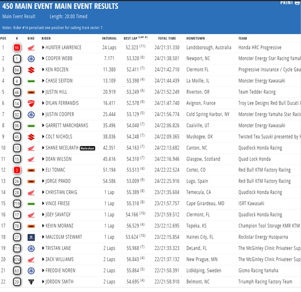 Hunter Lawrence heeft in Nashville een belangrijke zege geboekt. Lawrence won de finale voor Cooper Webb en Ken Roczen.