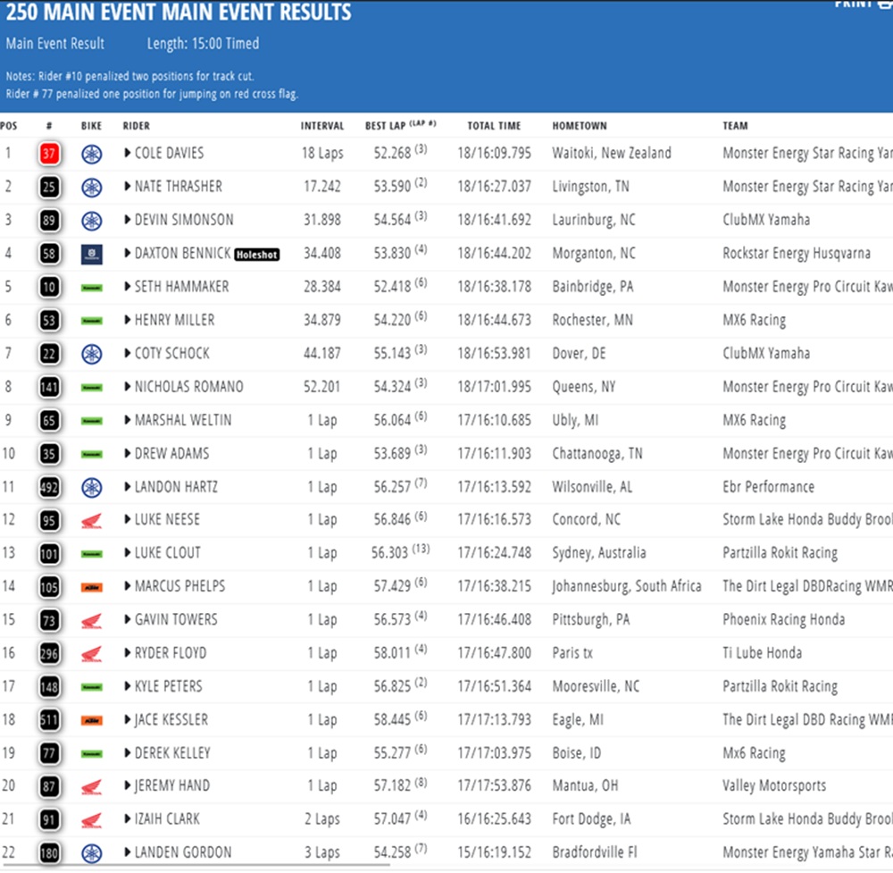 In de 250 klasse ging de zege naar Cole Davies voor Nate Trasher en Seth Hammaker!