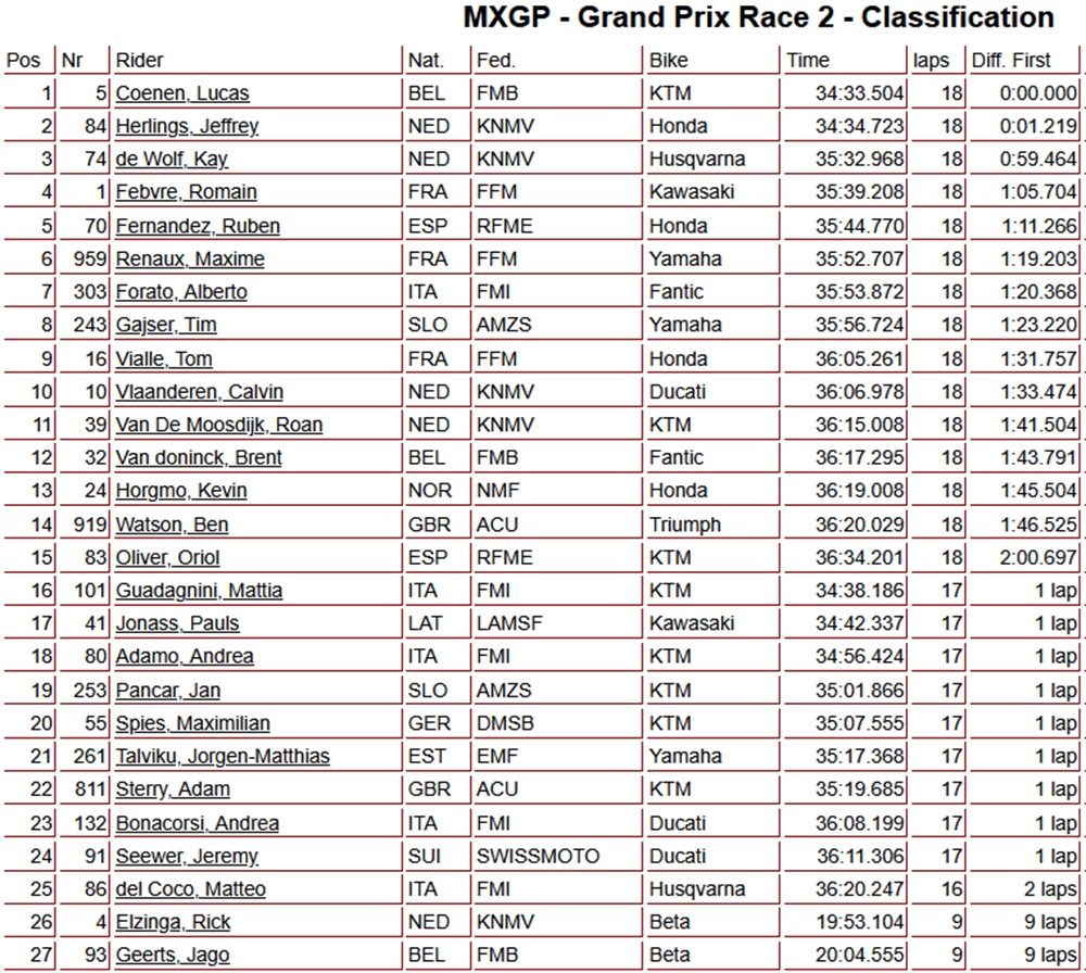Lucas Coenen wist snel de leiding in handen te nemen en leek onbedreigd naar de zege te rijden, tot hij in de slotfase ten val kwam. Hierdoor verdween zijn voorsprong van twaalf seconden en zat Herlings tot de finish vlak achter de Belg, helaas voor de Nederlander kwam hij net te kort. Kay de Wolf reed een hele knappe wedstrijd, nadat hij de eerste ronde buiten de top twintig door kwam wist hij zich terug te knokken naar de derde plaats. Het podium in de MXGP van Sardinië was voor Lucas Coenen, Jeffrey Herlings en Kay de Wolf.