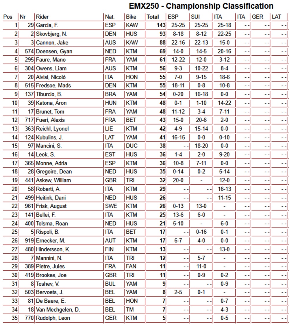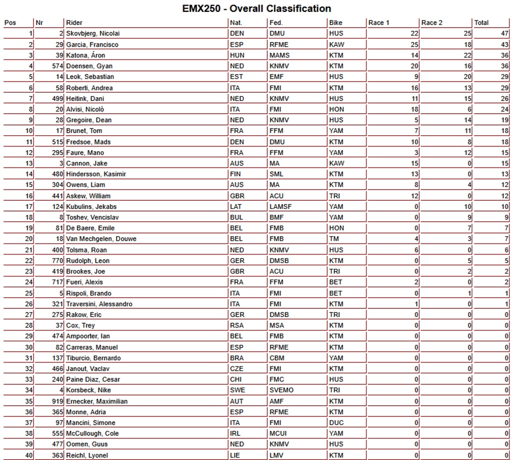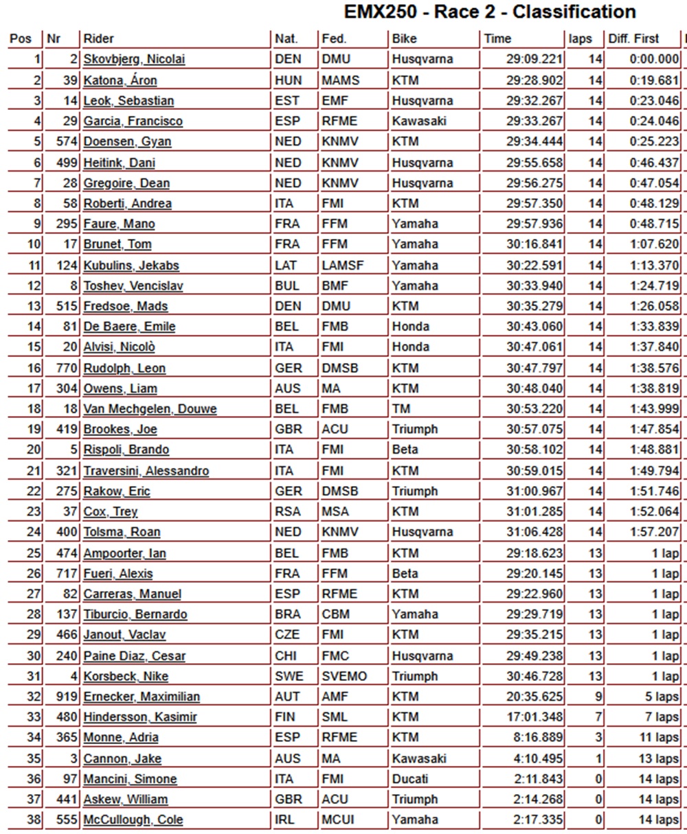 Nicolai Skovbjerg heeft de tweede manche van de EMX250 in Sardinië gewonnen. Aron Katona eindigde als tweede, gevolgd door Sebastion Leok op de derde plaats en Fransisco Garcia als vierde. Met zijn sterke optreden verzekerde Skovbjerg zich tevens van de eindzege van het evenement, voor Garcia en Katona.