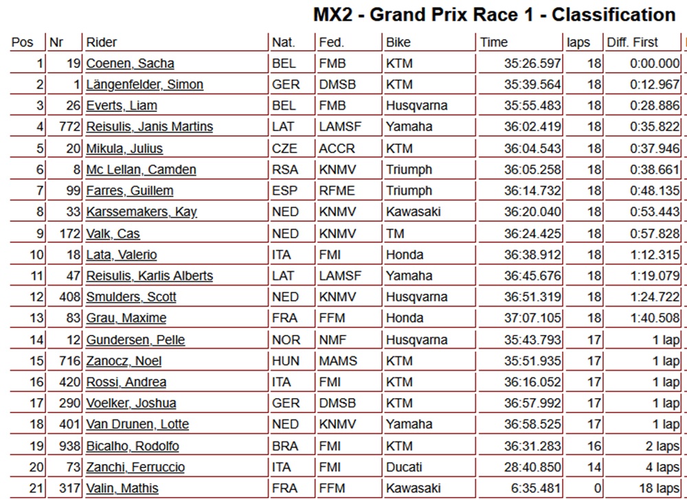 Sacha Coenen heeft de eerste manche in Riola Sardo gewonnen. De Belg greep, zoals bijna gebruikelijk, de hole shot en gaf de leiding niet meer uit handen. Het was voor Coenen zijn eerste manche zege van het seizoen. Achter de Belg was het Simon Langenfelder op twee en Liam Everts kwam op de derde plaats binnen. Janis Reisulis kwam op de vierde plaats binnen met achter hem de Tsjech Julius Mikula.