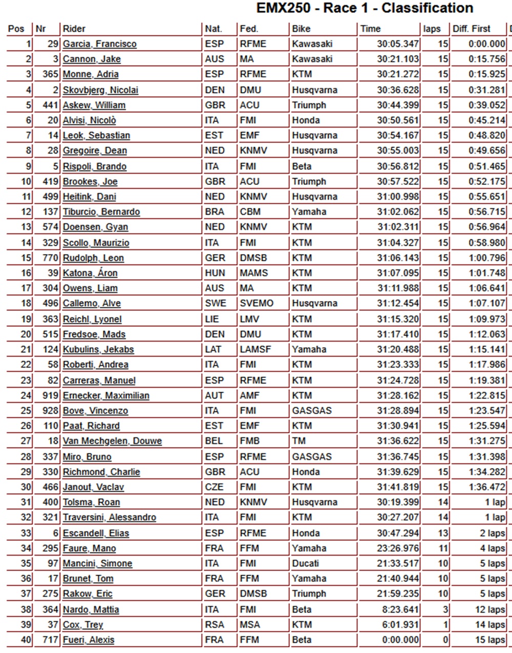 Francisco Garcia heeft de eerste manche van de EMX250 gewonnen. De Spanjaard nam in de tweede ronde de leiding over van Dean Gregoire en reed daarna weg bij de concurrentie.