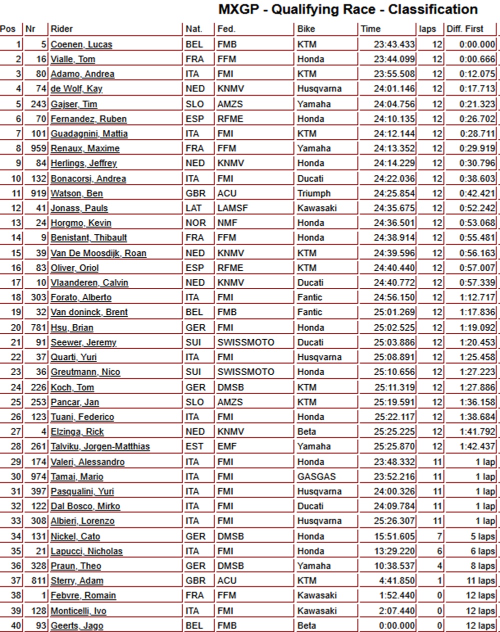 Tom Vialle wist de hele wedstrijd vlak achter Coenen te blijven, maar het lukte hem niet om de kampioenschapsleider te passeren. Andrea Adamo wist voor zijn thuispubliek als derde te finishen, voor Kay de Wolf en Tim Gajser.