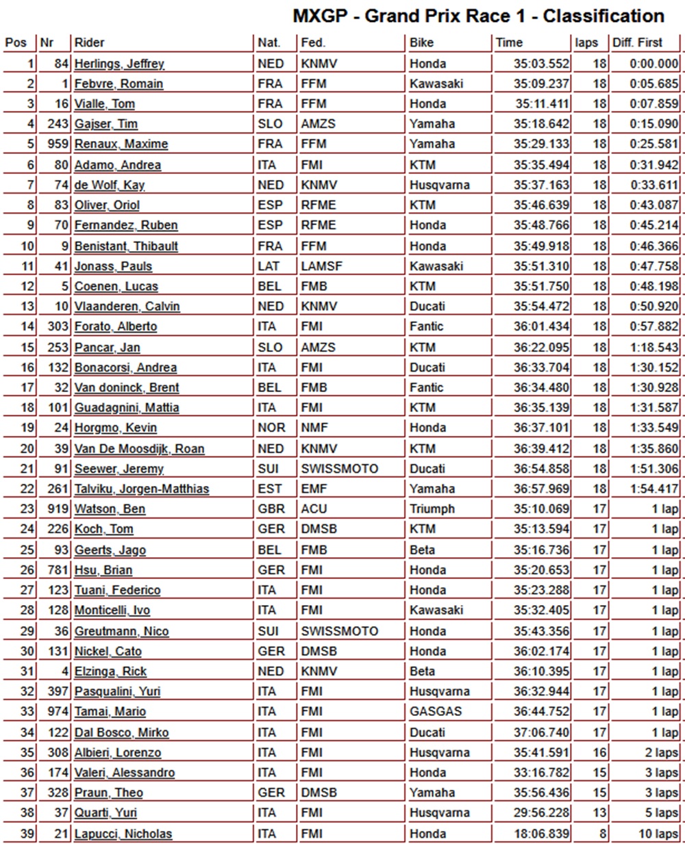 Op het moment dat hij de aanval opende op de top 3, reed hij ronde na ronde de snelste wedstrijdronde en vocht hij zich naar de kop van het veld. Iets wat ook werd gewaardeerd door het publiek dat massaal achter de Nederlander ging staan. Achter de ontketende Herlings werd Romain Febvre tweede voor Tom Vialle, Tim Gajser en Maxime Reneaux. Kampioenschapsleider Lucas Coenen kwam in de beginfase ten val en moest genoegen nemen met de 12e plaats.