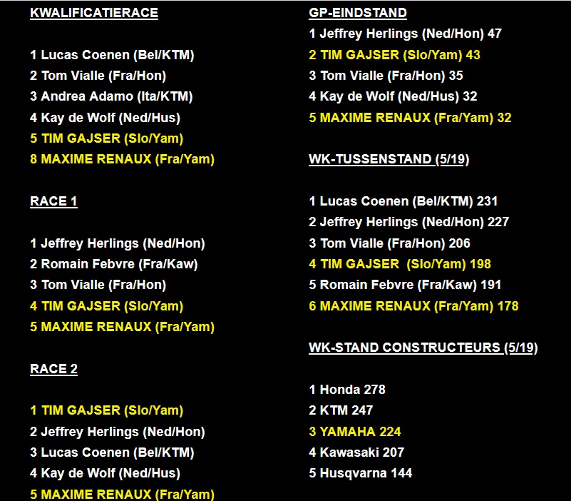 Gajser: “Dit is precies het resultaat dat ik nodig had. Ik wist nochtans dat het een moeilijk weekend zou worden, na die crash in Riola Sardo vorige week. Ik heb deze week veel pijn gehad. Het was op de tanden bijten dit weekend, maar ik heb alles gegeven. Net als mijn Sloveense fans. Ze hebben me erdoor gesleurd. Ook een dikke merci aan iedereen in het team. Ze hebben er alles aan gedaan om me klaar te stomen voor deze GP. Ik ben blij dat er nu een break aankomt. Eerst tijd nodig om te genezen en daarna weer volle bak aan de slag.”