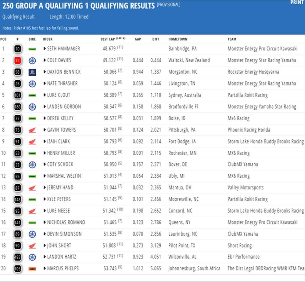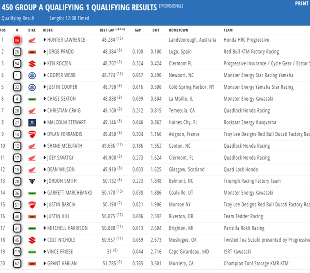 Hammaker en Lawrence snelste in Philadelphia by motocrossplanet25 april 2026 Seth Hammaker en Hunter Lawrence hebben in de eerste tijdtraining van de Supercross in Philadelphia de snelste tijd op de klok weten te zetten. Jorge Prado trainde in de 450 klasse als tweede voor Ken Roczen! Photocredits – Align Media