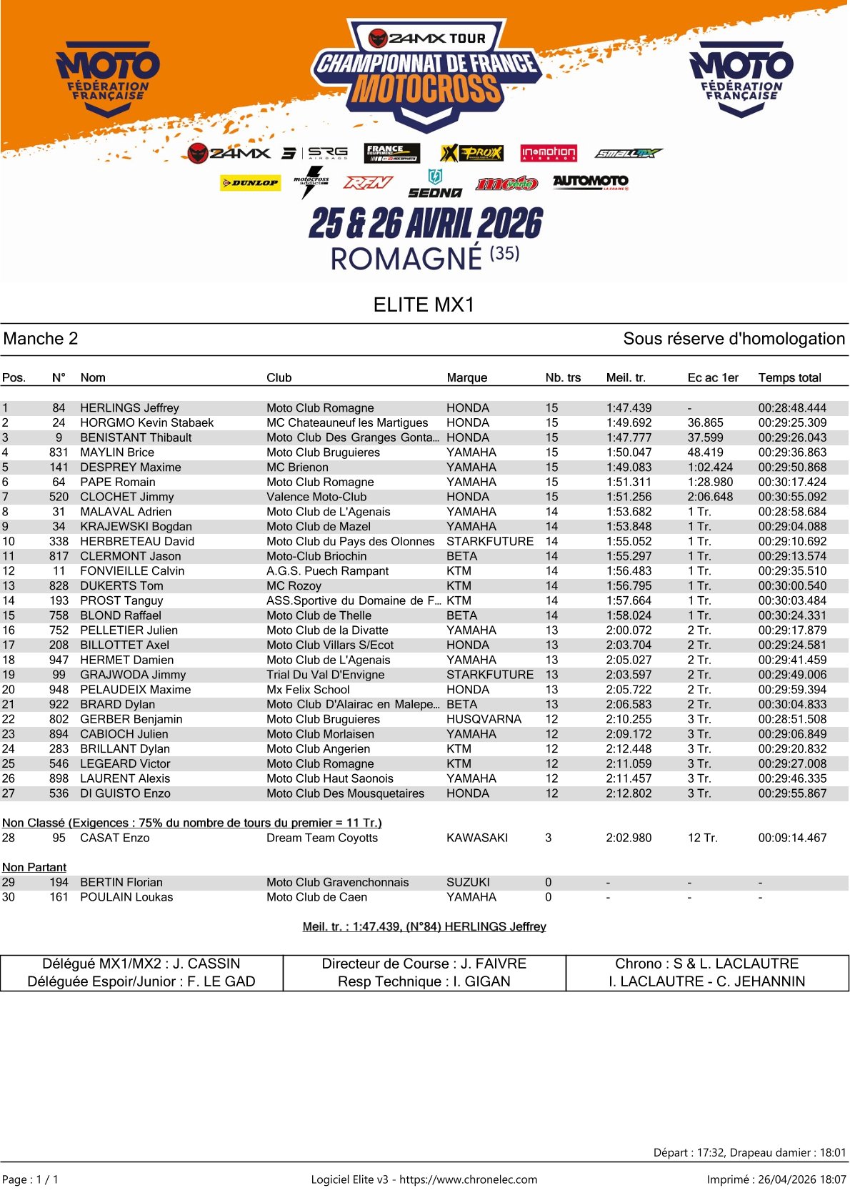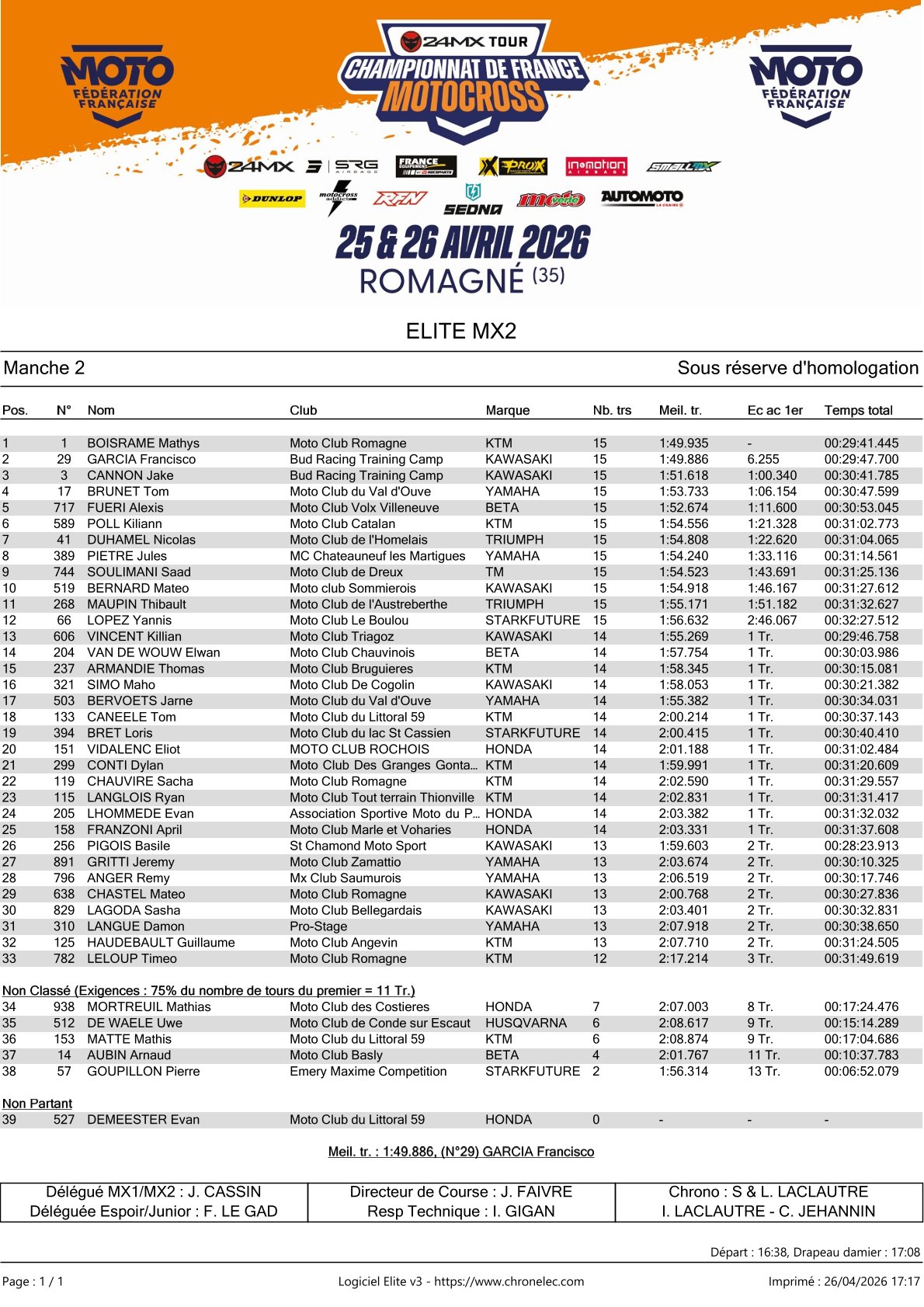In de MX2 klasse ging de zege in de tweede manche naar Mathys Boisrame voor Francisco Garcia en Jake Cannon. Jarne Bervoets werd negende en zeventiende in de manches.