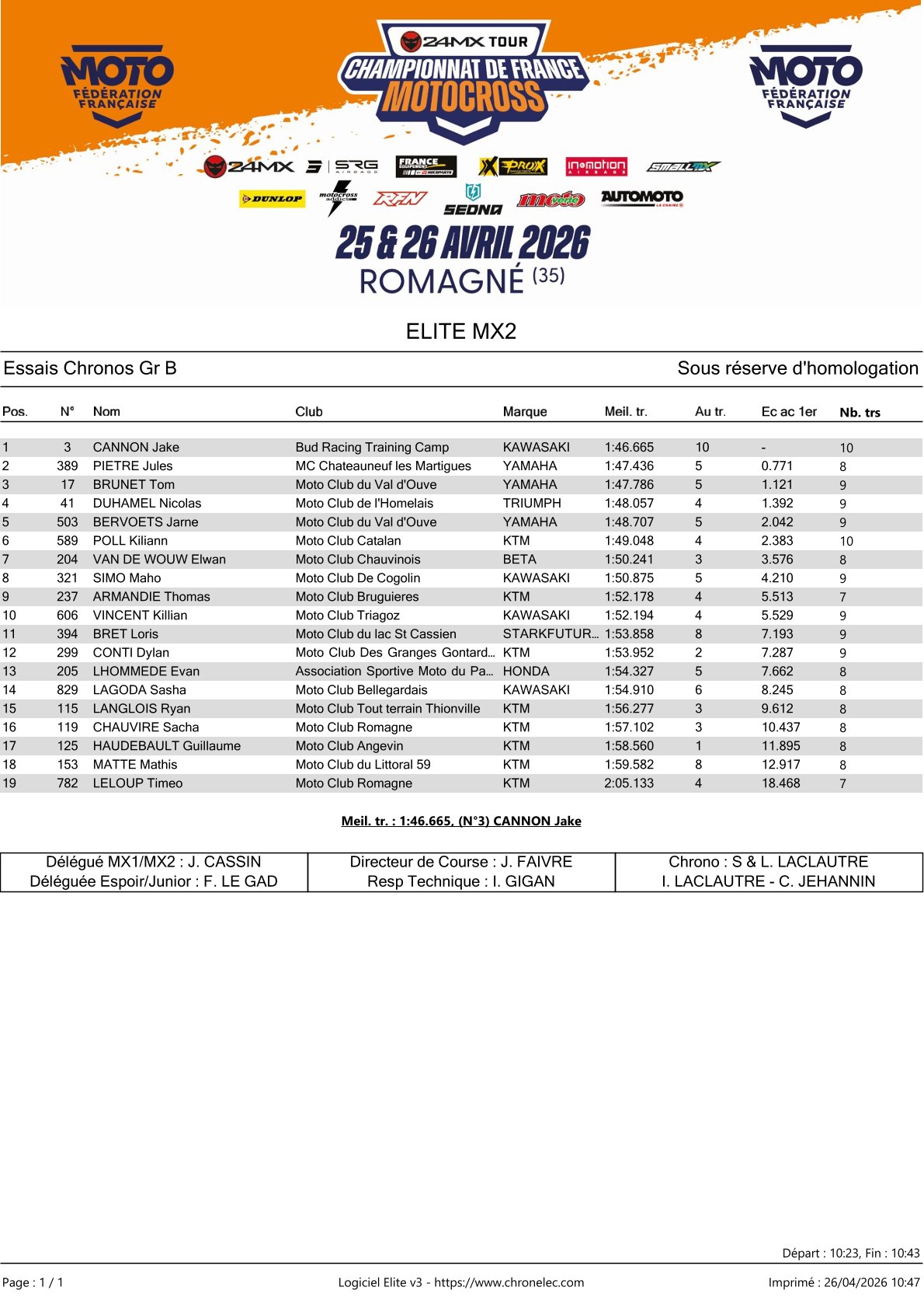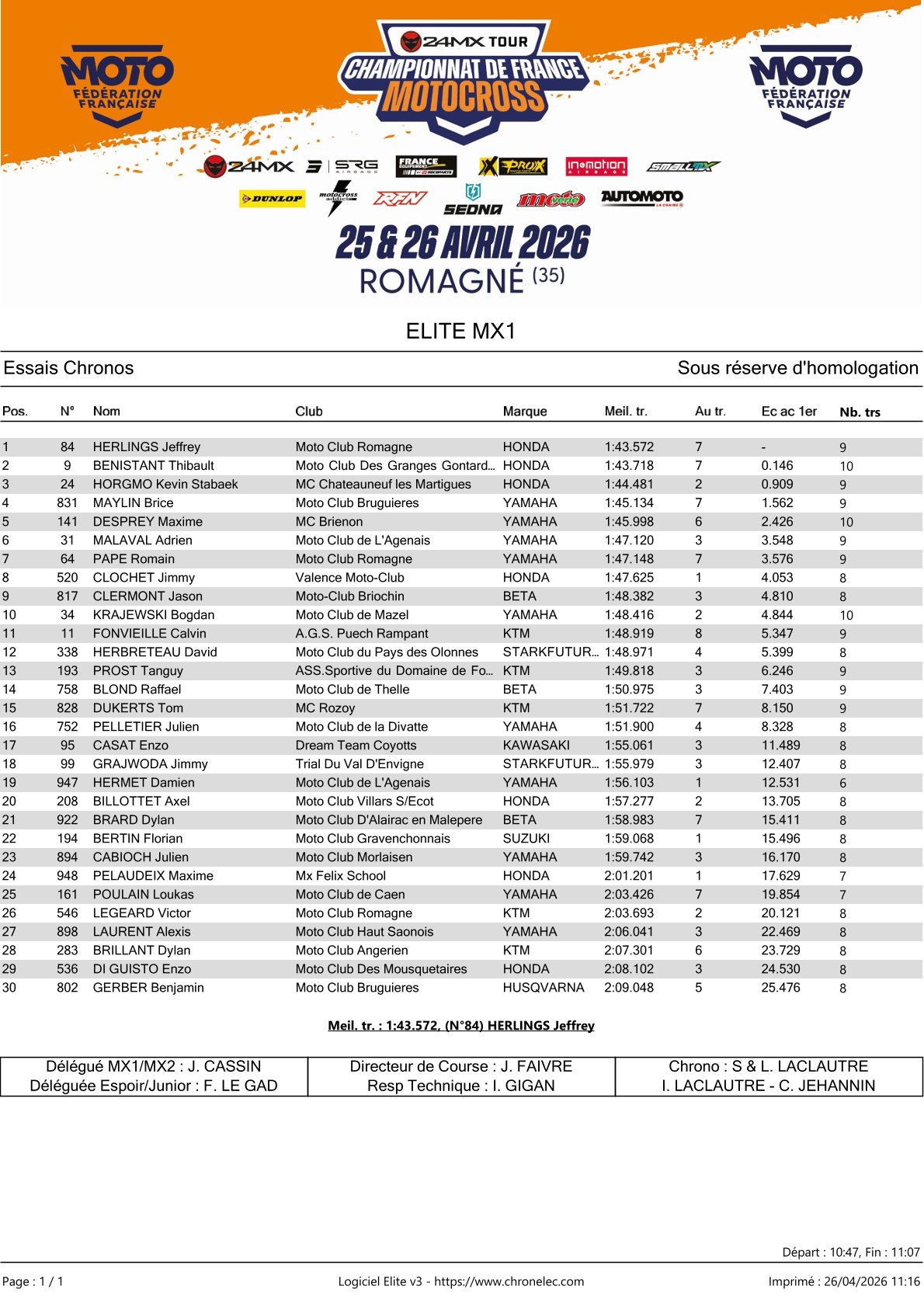 Jeffrey Herlings heeft in de tijdtraining van het Frans Kampioenschap in Romagne de snelste tijd op de klok weten te zetten. Herlings was hiermee een fractie sneller dan Thibualt Benistant en Kevin Horgmo trainde als derde voor Brice Maylin en Maxime Desprey.